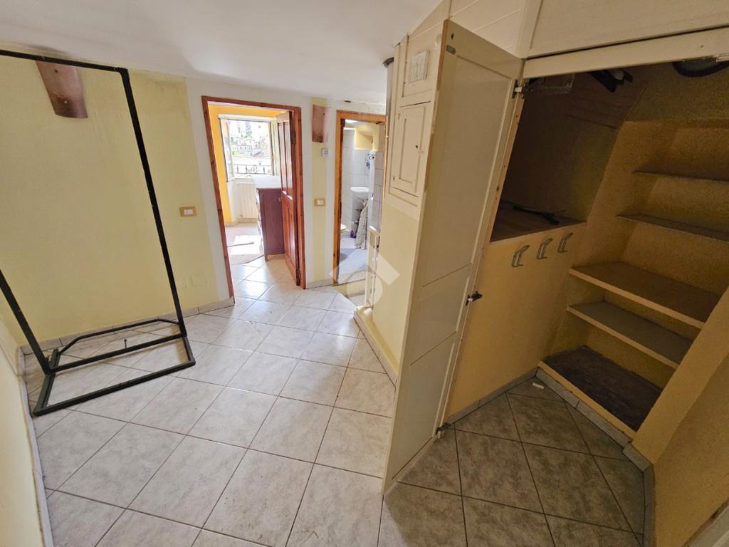 Salendo al primo piano, tramite scala condominiale, accediamo al resto della casa divisa internamente su due livelli: al primo livello troviamo il soggiorno con la cucina vista, salendo al secondo livello troviamo invece due camere da letto, una piccola cabina armadio e un bagno finestra con doccia.